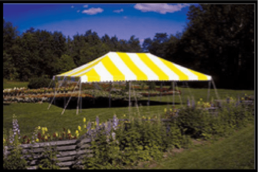Pole Tents are the most cost-effective way to provide cover for your party or event. These tents have center poles supporting the structure within the interior space, and must be staked into the ground. Each tent has rope lines that extend out approximately 6 ft around the perimeter of the tent.